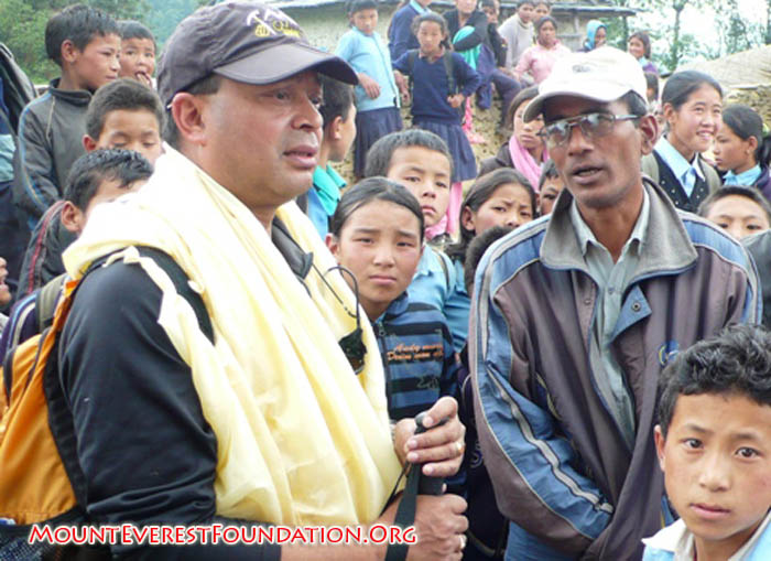 Lots of children follow us from Charmading school. MEFSD directors Jangbu and Murari with teachers and staff of Charmading school. Murari Sharma, director of MEFSD speaks with Charmading head teacher Tej Narayan Chaudhary (Dan Mazur).Back to top