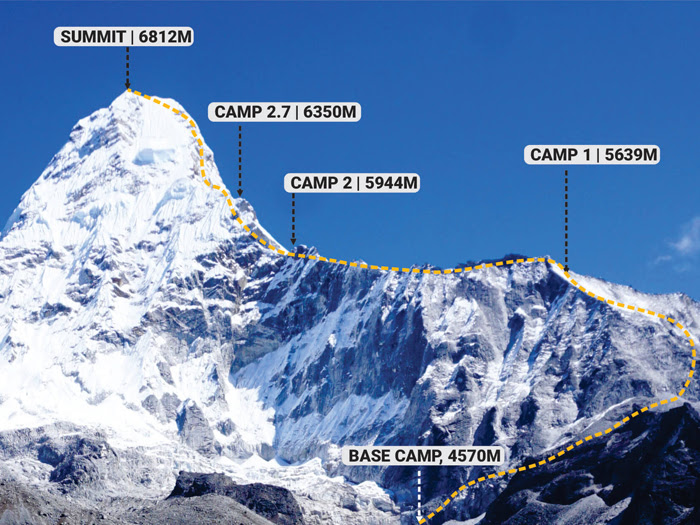 AmaDablam - November 2023. Asia's famous rock, snow, ice climb. Himalaya's Matterhorn: very climbable, moderately technical. Excellent prep step to 8000 metre climbing and great training for Everest! This is our 15th Ama Dablam expedition and expert friendly patient leader Paul Spackman, together with amazing Sherpas teach and review all technical climbing skills you need to know. Excellent skills training refresher on easy cliffs in basecamp. 29 Days. Quick and Inexpensive, combine with Lobuche and enjoy Two Peaks in One Trip!