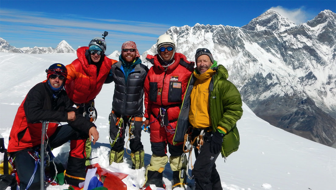 Daniel, Jessica, Rob, Tenji and Rick on the Summit of Ama Dablam in November. Nuptse, Everest and Lhotse in the background, just 12 kilometres / 20 miles away.