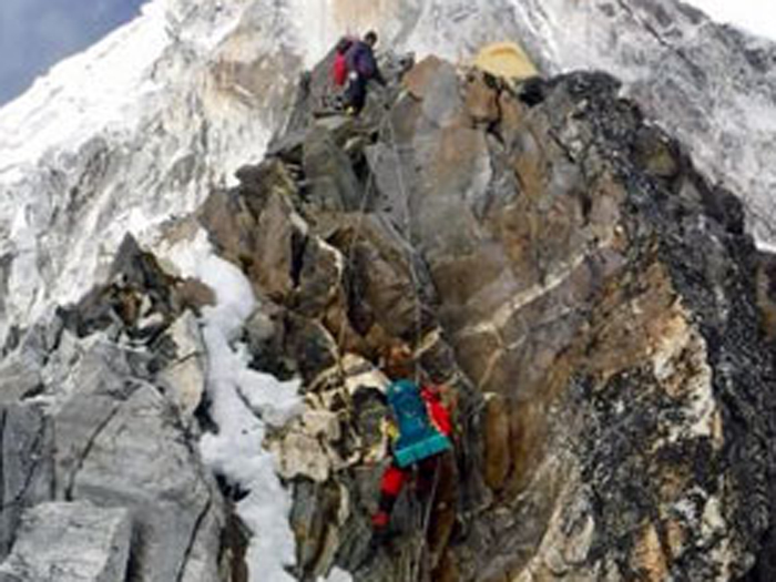 The crux is the Yellow Tower at 6000m, 19,700 ft. With only 2 easy moves (not pitches) of NA class 5.5, French 4, or British Severe, this is not a difficult rock climb. Ama Dablam is often over-graded because the route is very “airy”exposed but it is not technically demanding. Ama Dablam is a very do-able fixed rope climb on solid rock, snow and ice.