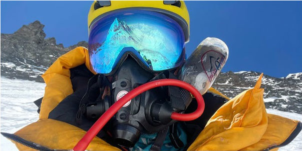 During the summit storm, Mount Everest is reflected in the mask. Image: z