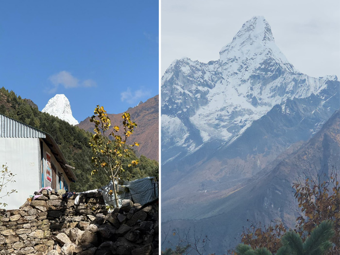 6 Nov - Today our Ama Dablam Team had an enjoyable rest and acclimatisation day in Namche Bazaar, the capital city/village of the Sherpa people. We awoke early and enjoyed a tasty breakfast. Afterward we walked up the steep hill just above our hotel, and then along a ridge, the Everest View Hotel. The weather is superb today so we have 360 degree views so many of the Himalayan peaks, including Mt. Everest and Amadablam. We had a cup of tea and then headed back down to Hilltop Lodge for lunch. After lunch we went to have a look at the museum, which is really very well done, better than your average museum. We loved the old traditional style Sherpa house, and the historic vs modern photo collection was incredible. This afternoon we occupied ourselves with eating chocolate cake and drinking cappuccino, which seem to be some of the two main food groups of Namche bazaar!