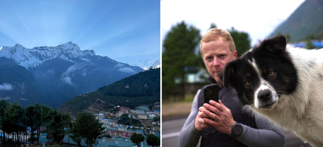 Cpation : Namche Bazaar. Team member with Lukla dog. Photo : Peter and Wendy