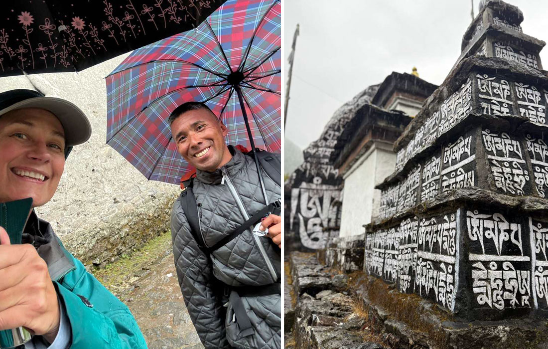 31 Oct - Happy Halloween and hope everyone is having a spooktacular day !! Today we walked to Pangboche. Some light/medium rain but not too bad. We are getting used to this now, or so it seems (better be careful what you wish for)! Leaving Namache after breakfast, we dropped a lot of elevation through Rhododendron forest to Fungki Thangka for lunch and then made the big climb up to Tengboche Monastery, where monks are chanting and spinning prayer wheels for all of us. There is a pretty good bakery and coffee shop at Tengboche. It’s a pretty hike through Rhodies and Hemlocks with a slight downhill to Deboche, the home of the Ani’s Gompa, one of the oldest nunneries in Nepal, and the site of the famous Deboche Project, where some wonderful sponsors are working hard to preserve Sherpa Women’s Culture. This is prime musk deer habitat, and we were hoping to see one, munching on Rhododendron leaves. Then we crossed over a suspension bridge to hike the last long gradual uphill to Pangboche town, passing through Himalayan Tahr Mountain Sheep habitat on the grassy cliffy slopes above the Dudh Khosi River Gorge. Finally we made it into Pangboche, to the far end of the village where we were welcomed to a nice cup of tea and a warm dry dining room at the lovely Sonam Lodge. A long day but highly rewarding and guess what, we are only 5 metres shy of 4000 metres, a real benchmark in our quest for altitude acclimatization attainment. Our advance member is waiting patiently in Dingboche. Tomorrow is the day we will meet up and our Lobuche team will finally be complete. Our Himalayan Hiker is enjoying maximum rest in Namche today.