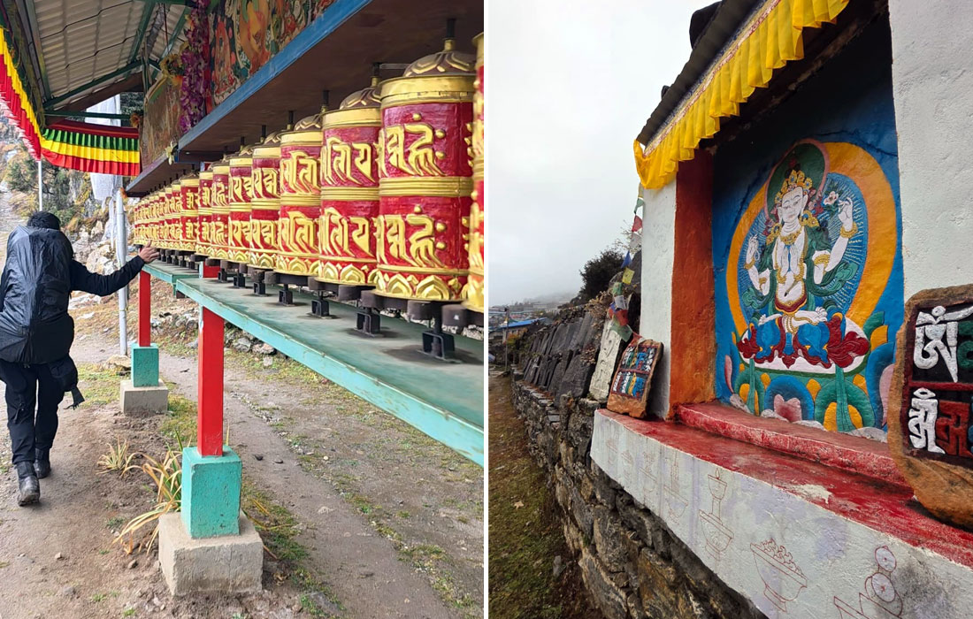 Caption : Prayer wheels and Lord Buddha’s painting blessing the trail to Phakding.