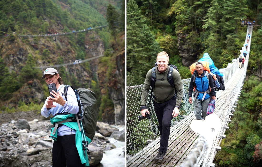 Caption : One of the many suspension bridge. Team at Lukla. Photo : Sebastien.