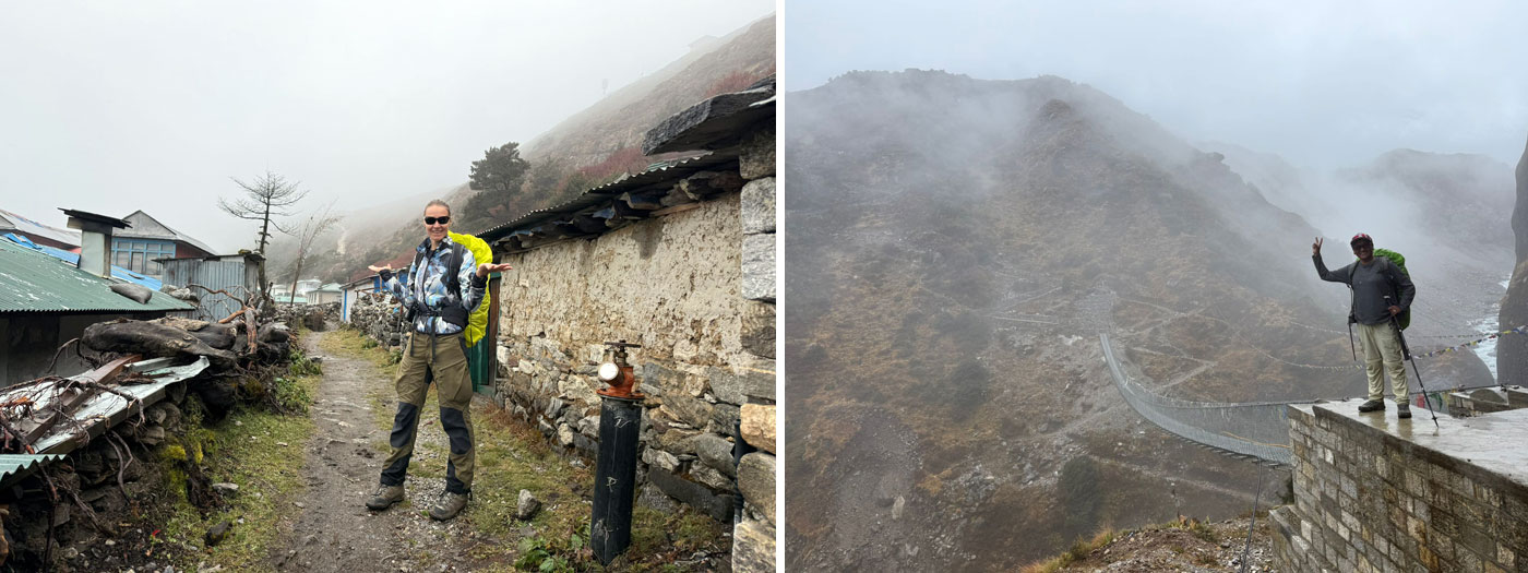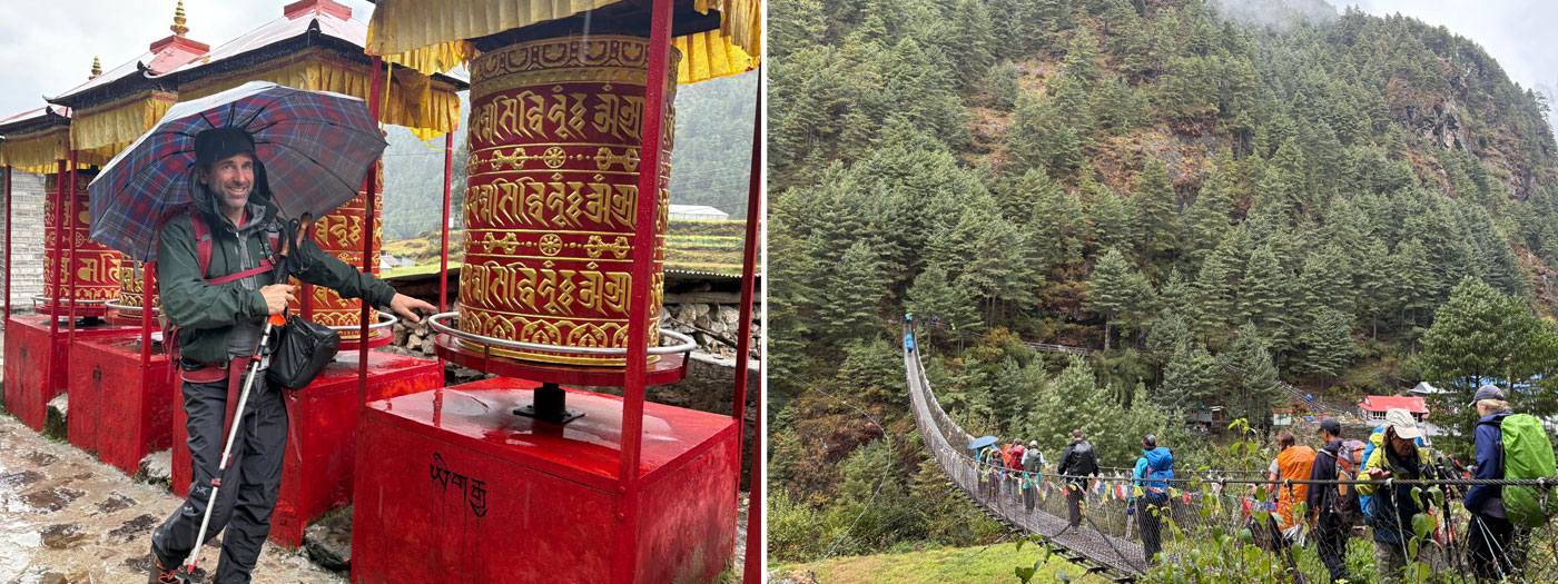 29 Oct - We got up early, had breakfast and started walking up the trail. The rain abated and it stayed mainly dry. We walked through the villages of Benkar and Monjo and entered Sagarmatha National Park. After completing a few entry formalities we stopped for lunch at Buddha Lodge in Jorsalle, along the roaring Sun Khosi River. After lunch we trekked through pretty forests and started climbing up, crossing the famous suspension bridge at the junction of the Dudh Khosi and Bhote Khosi Rivers. Then it was uphill all afternoon, walking at a slow steady pace with plenty of rest stops, until the first glimpse of Namche Bazaar, where we got to stroll through Namche’s water park with all of the lovely water powered prayer wheels, wander the streets of downtown Namche, have a quick cappuccino and a slice of apple pie, and then climb the final hill up to Hilltop Lodge where we will be staying for the next few days. Hilltop Lodge is a beautiful lodge with fabulous views down into Namche Town and looking across the valley to Kwangde Ri, the massive peak dominating the skyline over the Bhote Khosi River valley. What a tough but rewarding day. Everyone is feeling quite well. Our early trekking group walked up to Pangboche today and our Road Warrior who trekked in from the end of the road also made it to Namche today, powerd by tongba drink. All of us are looking forward to getting some well deserved rest, eating lots of pizza, chocolate cake, having molti cappuccini and maybe even a pint or two