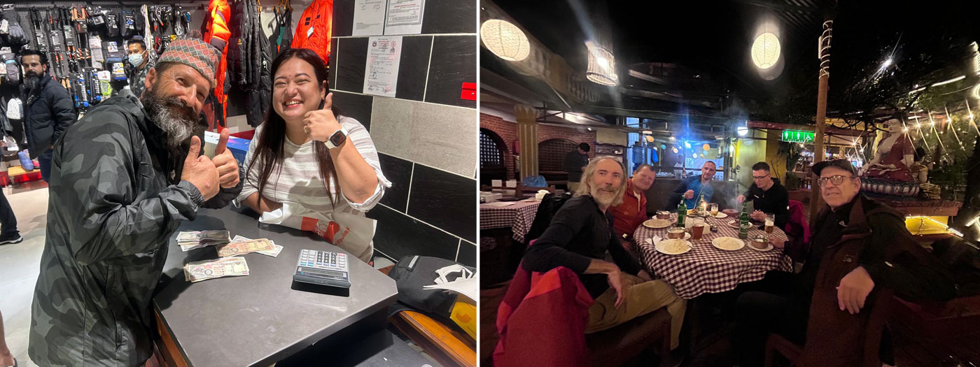 24 Oct Ama Dablam and Lobuche News: Yesterday a few members arrived, we checked their gear, did shopping for the few missing bits and pieces and they flew to Lukla this morning on the first flight. Incredible weather. Today more members arrived and we had a look at their gear and they went to the Ktm hire shop and hired/rented the high altitude warm clothing, big mitts and big boots. They changed money and got cash out of the cash machine. We ate a few meals together especially yummy pizza, and then went out to a local Pub to enjoy our team camaraderie and stay hydrated