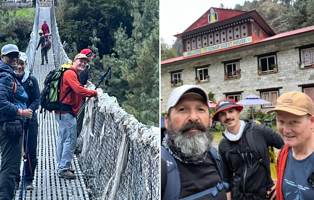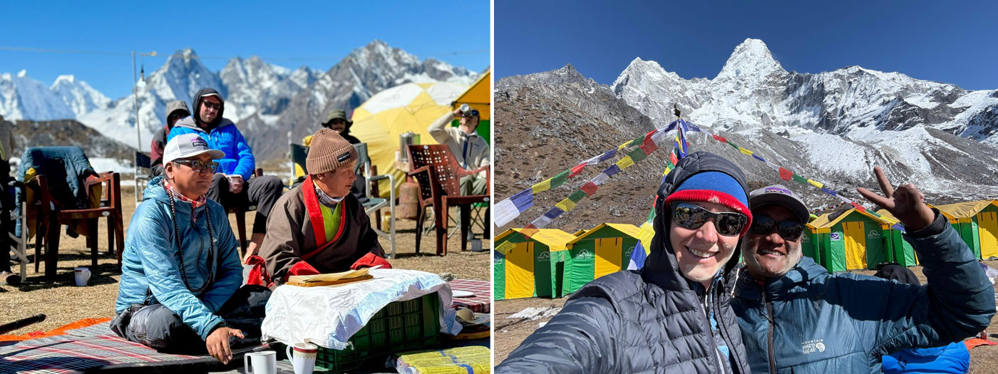 Our Ama Dablam only team woke up on a gorgeous sunny morning in Namche and enjoyed the walk along the chorten dotted Kangzoma ridge and down through the Hemlock forest to Fungki Tangka for a delicious lunch at the base of what must be the Khumbu Valley’s largest Hemlock tree. Incredible views of all of the mountain peaks including Everest, Ama Dablam and Thamserku dominated the skyline all around. Then we climbed up the massive Tengboche Hill, to enjoy exploring around the Tengboche Gompa and enjoy cappuccino and chocolate cake. Yes, even here! Following the path down through the Rhodendrons to Deboche Village, we crossed the Dudh Khosi on a suspension bridge and then climbed through rocky steps up to Pangboche Village. Its really good to be here in the super comfortable Sonam Lodge with such stunning views of Everest, Lhotse, Nuptse, and Tawoche, right at the base of Ama Dablam. Welcome!