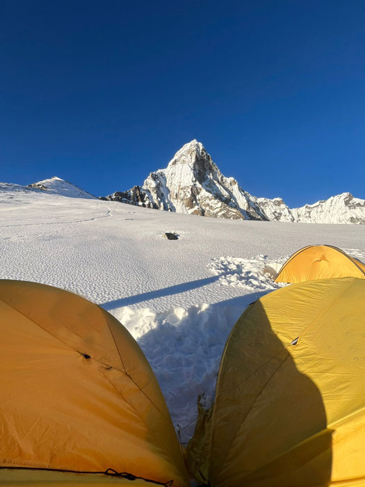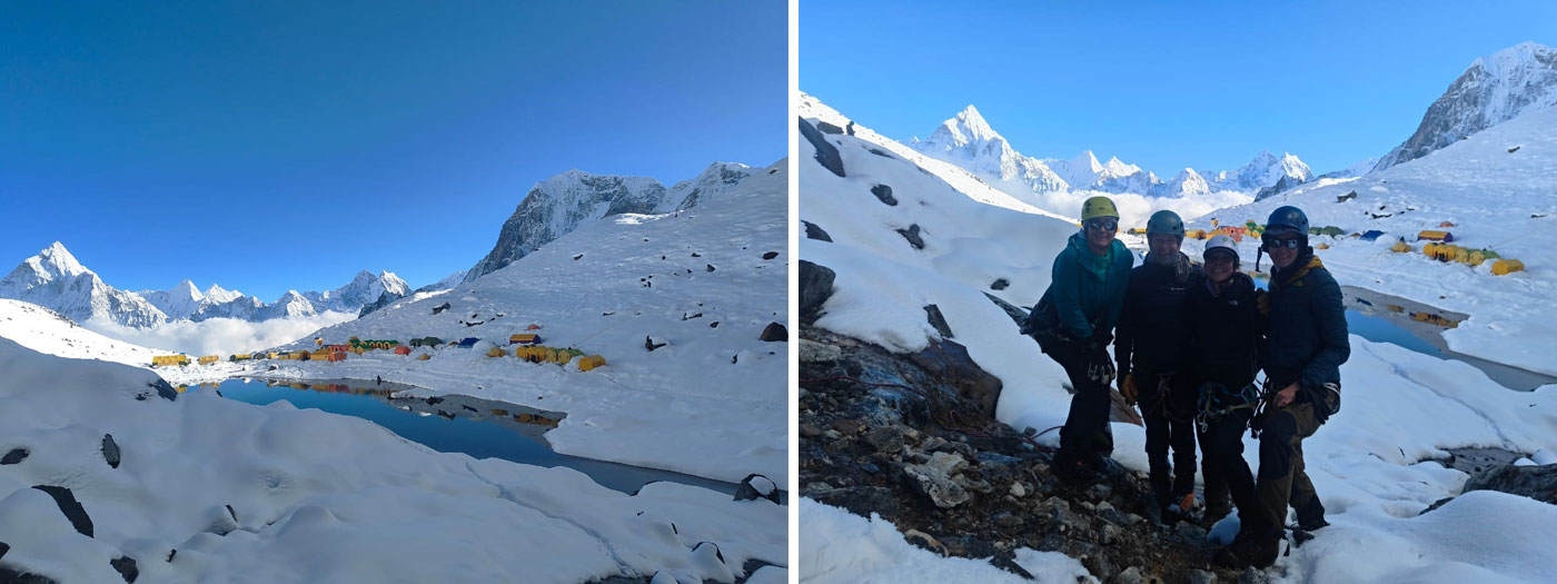 13 Nov - Last night was windy in ABC, making it challenging to sleep. This morning it took us a while to get going while the sun warmed the tents and our amazing ABC cooks brought us hot tea and food in our sleeping bags. Finally we 4 Ama Dablam Only members and 2 Sherpas got packed up for todays trek up to C1. We put on our warm gear and crampons and headed up through the boulder field, now covered in a half metre of snow, and up the “apron” to C1, also plastered in deep snow. The wind is definitely less in C1. Then the 6 of us headed back down to ABC for tea and then back down to BC. A long hard day of slippery snow trekking in the sun and wind. Crampons required. Looking forward to a much needed rest. 2 of our members who came to us via the Lobuche Peak approach waited in ABC with 1 Sherpa until we reported in from C1 that the wind was less, and then they headed up to C1 to camp for the night. Their goal is to touch C2 tomorrow and enjoy the rock climbing up there, and then return to Ama Dablam BC for a good rest before heading to the summit.