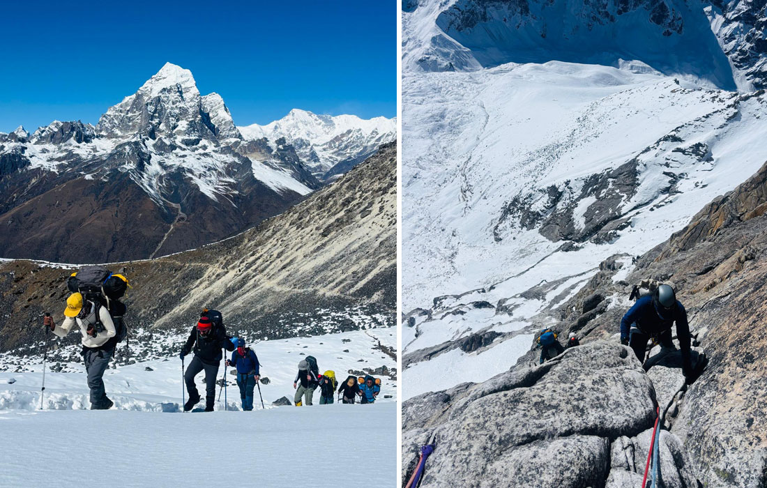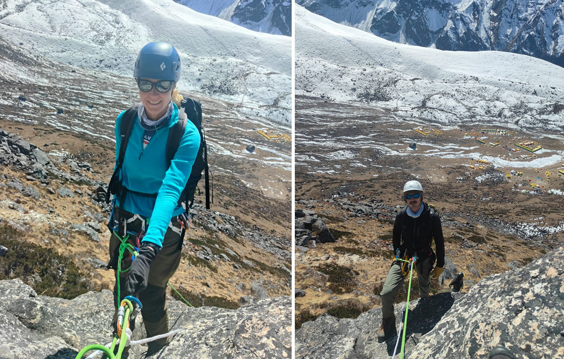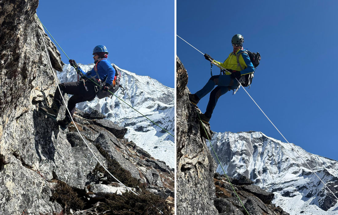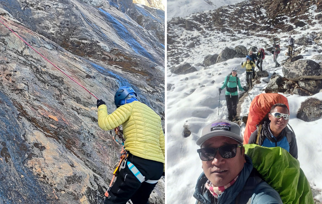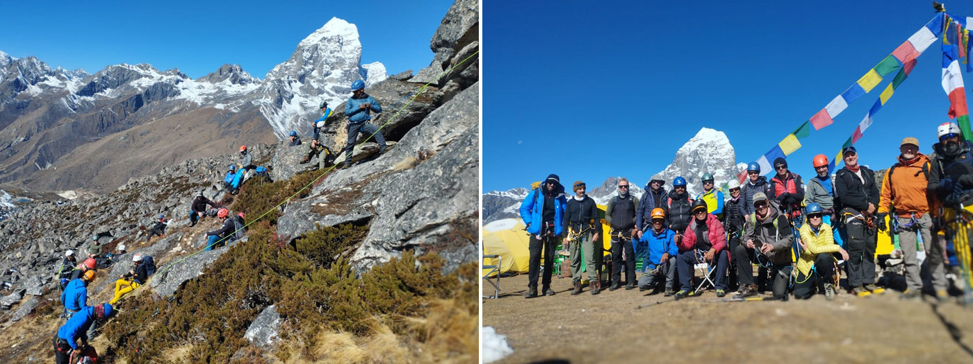 Caption : Members having rock climbing before climb. Ama Dablam Team Members. Photo : Tenji.