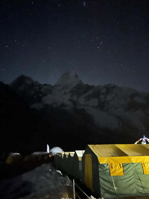 12 Nov - Today, our high altitude porters dropped the members duffle bags at Advanced Base Camp (ABC). 6 of our team members hiked up to ABC with three Sherpas. The conditions were warm with snow on the trail. Crampons came in handy on the upper part. Cresting the ridge to ABC, the wind really picked up, so it was nice to have a well made and securely anchored tent to dive into, with a hot cup of tea and big dinner prepared by our ABC kitchen, where two cooks with a kerosene stove, lots of extra food and freshly melted clean snow are permanently stationed, just for our team! Our expert advanced Sherpa route pioneering team climbed up to Camp 2 and shoveled and cleared three tent spaces in C2 and checked the available tent spots. It now seems that ours is the last group on Ama Dablam this season, so we will have no difficulty in finding spots for our entire team in C2. This reduction in route pressure coupled with an extremely favourable ten day weather forecast is setting up our five groups for success. However, best not to count our chickens before they hatch. Our goal now is to anchor our team’s focus on maintaining member and Sherpa health and keeping a positive outlook. As you know, climbing these Himalayan Giants is not only about physical prowess, but it is a mentally and emotionally challenging endeavor as well. We can’t have one without the other!
