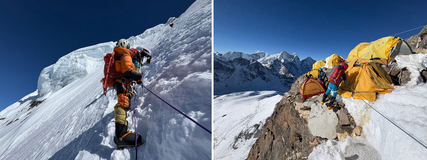 Caption : Team members enjoying at Camp 1. Photo : Allison. Team members are getting ready to climb. Photo : Dorje.