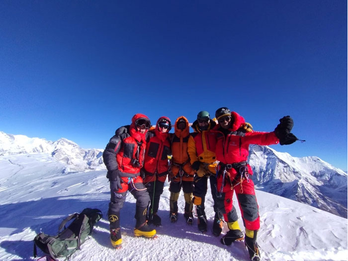Caption : Team at the Lobuche Summit Ridge. Photo : Dorje.