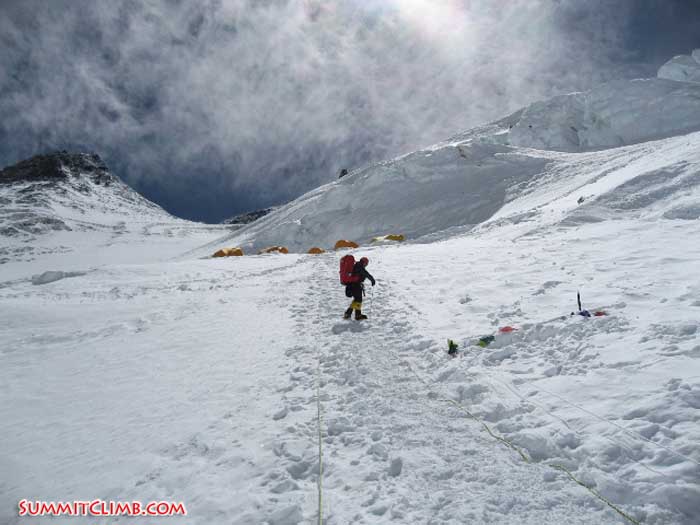 Sange Sherpa went up to camp 3 today to reconnoiter today. There was a big wind storm a couple of days ago that knocked out a bunch of our tents so we had to replace those tents and also that same windstorm affected all the other teams. All of the other teams lost tents on the mountain in Camp 3. In this camp today we have Eric Peterson. He has checked in from Singapore and he’s down there with Gyalje Sherpa together with Jay Bahadur. So all of the teams are planning to move up tomorrow and we’ll keep you updated.