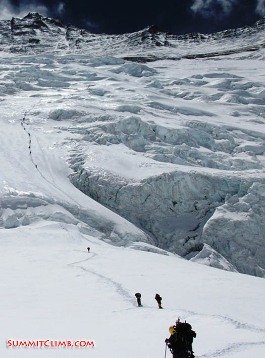 Stewart Edge climbing the final few steps into camp 3. Thats the Geneva Spur on the left (Squash Falconer). Climber works her way up the hard blue ice at the top of the Lhotse face (Alex Holt). Climbers work on crossing the Bergschrund at the base of the Lhotse face, enroute to camp 3 (Alex Holt). Making the big climb up to camp 3. Check out the big string of climbers climbing into camp 3 on the middle right side of the photo (Alex Holt).