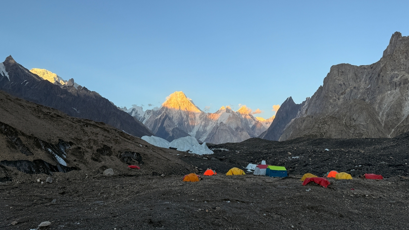 12 Aug - Sad morning: we lost one of our members today. Jose had to be evacuated by helicopter. Everyone, please don’t worry — he will be okay. But now it feels like there’s a hole in our team. Jose, you are missed very much. We walked to Broad Peak Base Camp along a long, gently rising moraine beside a smooth white glacier. We met the first K2 summiter of the season, Prakash Sherpa. He was running down the glacier carrying a huge rucksack when we saw him. He told us he had made it from the summit down to K2 Base Camp by 2 a.m. Wow — Superman! This evening, as we sat in our comfy chairs around the dinner table, we looked south toward Concordia below. Further in the distance, mighty Mount Chogolisa lit up the evening sky in golden alpenglow. Known as K2’s wife, she is called the Bride Peak.