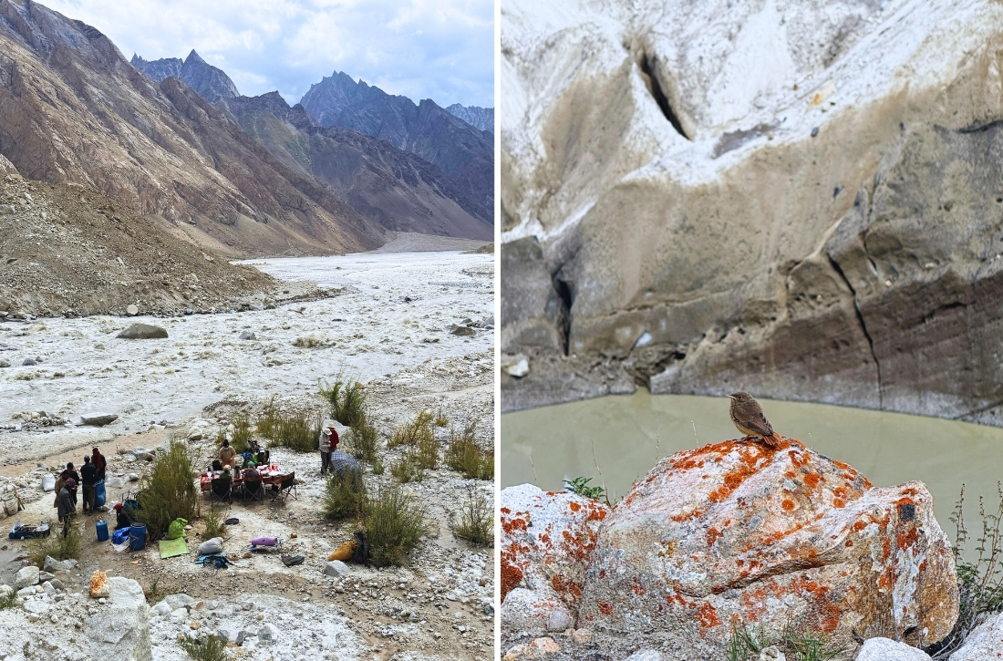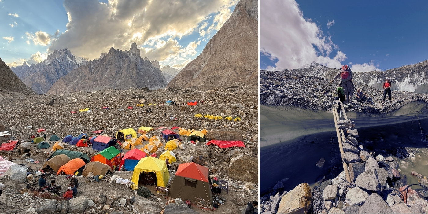 6 Aug - Set off early from Paiyu. We hiked up onto the massive Baltoro Glacier, which fills the entire valley. Said goodbye to the Braldu River and valley—now it’s rocky trails, up and down glacier moraines, and rounding icy green lakes. Reached Liligo in 5 hours for a pasta and mango lunch, then continued another 4 hours to Kuburtse Camp. Luckily, we crossed the Kuburtse River on a wooden bridge. Big day, big dinner. Good night!