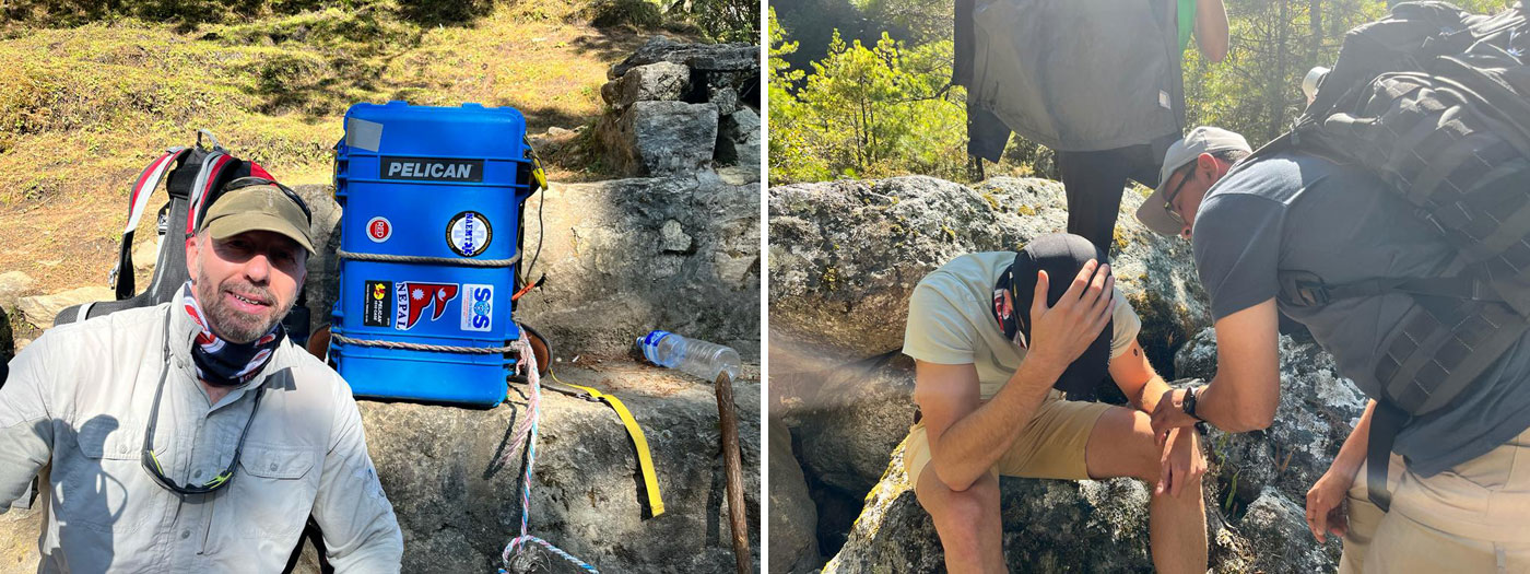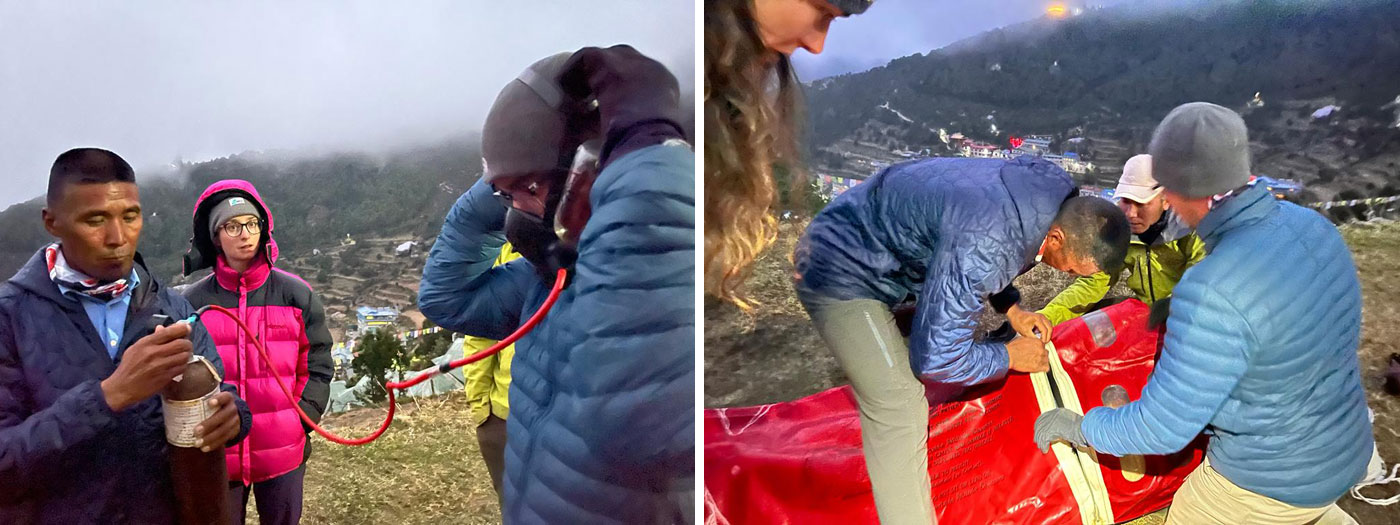 Oct 22 - Today the team trekked from Phakding to Namche Bazar. Incredible weather and views, we practiced patient assessment, and practiced with oxygen sets and the portable hyperbaric chamber